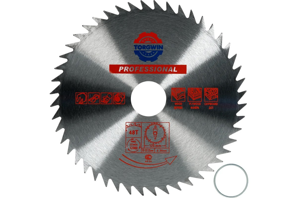 Диск пильный по дереву без победита 125x22.23 мм, 48 зубьев TORGWIN S67077Особенностью данного диска является отсутствие твердосплавных победитовых напаек. Это сокращает ресурс диска и время до заточки, но даёт более чистый и тонкий пропил.Положительный угол установки зуба на диске дает высокую производительность пиления. Прямая заточка и тип профиля острый (как у ножовки) подходит для чистового продольного и поперечного реза в мягкой и твердой древесине.Пильный диск предназначен для выполнения точных продольных и поперечных чистовых пропилов в мягкой и твердой древесине, прессованной слоистой древесине, фанере, ламинате, ДСП.Диск выполнен из качественной углеродистой стали.