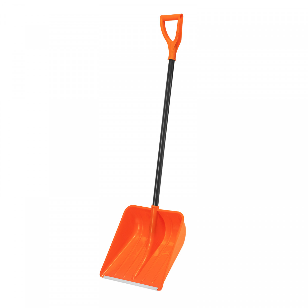 Пластиковая лопата Сибртех 61666 размером 400 х 405 х 1380 мм, со стальным черенком, используется для уборки снега на занесенных дорожках, тротуарах, подъездных путях.