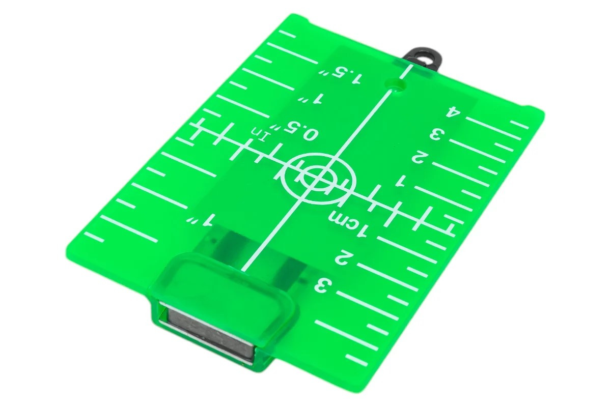 Магнитная лазерная мишень с подставкой предназначена для работы с лазерными нивелирами, оснащенными зеленым лазером. Этот аксессуар поможет вам производить разметку потолочных систем или каркасных конструкций, например под гипсокартон. Встроенный магнит позволит прикрепить мишень к потолочным направляющим или на каркасный профиль, а подставка позволит поставить мишень на пол или лаг. Мишень на своей поверхности имеет линейную разметку, которая позволит вам определить отклонение от номинального уровня и переносить контрольные точки при разметке лазерным нивелиром.
