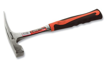 Молоток каменщика, 600 грамм, цельнометаллический, двухкомпонентная ручка. Цельнометаллический молоток из инструментальной стали, кованый, с точно выдержанным режимом термообработки. Рабочая часть бойка закалена и доведена до твёрдости 55 HRc. Удлиненный заточенный носок позволяет разрубать кирпич и камень. Вылет бойка исключен.