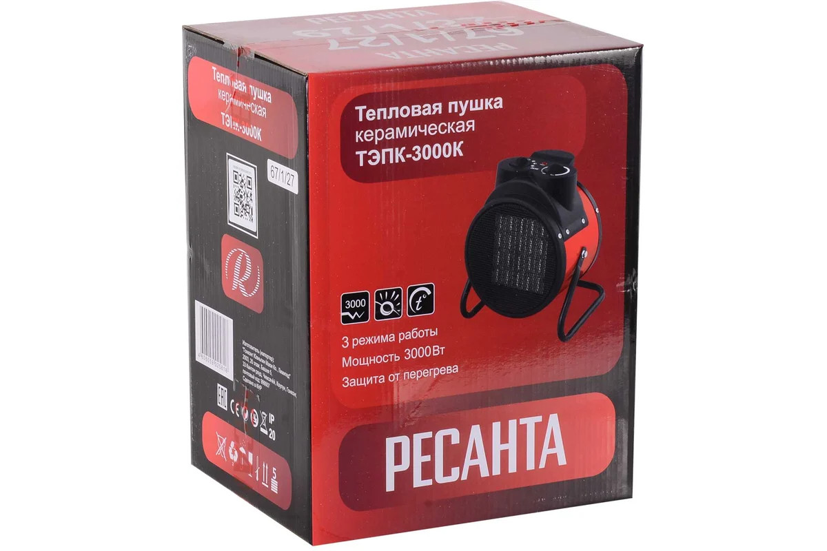 Благодаря небольшому весу и компактному размеру электрическую тепловую пушку легко перемещать и она не занимает много места. Автоматическая защита от перегрева делает эксплуатацию Ресанта ТЭПК-3000К безопасной и комфортной. Рекомендуется устанавливать оборудование на полу, исключая ковровое покрытие.