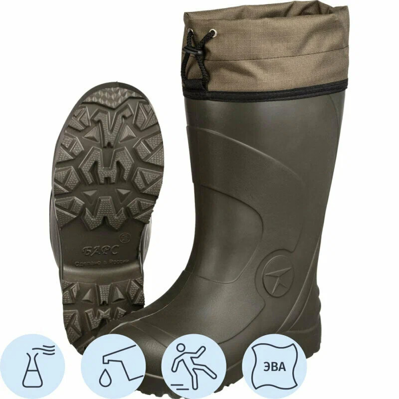 Сапоги цельнолитые мужские с композитным подноском и кевларовой стелькой не боятся ни воды, ни снега, ни грязи, отлично сохраняют тепло, не пропуская холод. Особенность модели: подошва с направленным ассиметричным противоскользящим протектором. Композитный подносок предохраняет ногу от удара, максимальная нагрузка на подносок 200 Дж. Антипрокольная кевларовая стелька достаточно эластична и комфортна для длительного ношения. Главная особенность кевлара — его прочность. Текстильная антипрокольная стелька с кевларовыми нитями более лёгкая, гибкая, имеет высокие теплоизоляционные свойства (особенно важно при работе в зимнее время года). Удобная колодка с комфортным подъёмом не сковывает движение при ходьбе. Хорошая эластичность и гибкость материала ЭВА сохраняется несмотря на низкую температуру, что делает их комфортными. Материал верха и подошвы обладают достаточной прочностью, что позволяет использовать обувь несколько сезонов.