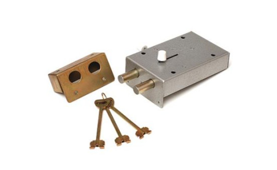 Замок гаражный, сейфового типа, накладной с задвижкой, 2 ригеля диаметром 17 мм, вылет 40 мм, 3 ключа. Замок накладной 7 сувальдный гаражный сейфового типа с задвижкой. Устанавливается на двери, сейфы, гаражные створки ворот толщиной до 70 мм. Два ригеля диаметром 17 мм. выходят на 40 мм. при полном запирании замка за три полуоборота ключа. Замок оснащен разблокиратором сувальд при запирании изнутри без ключа.